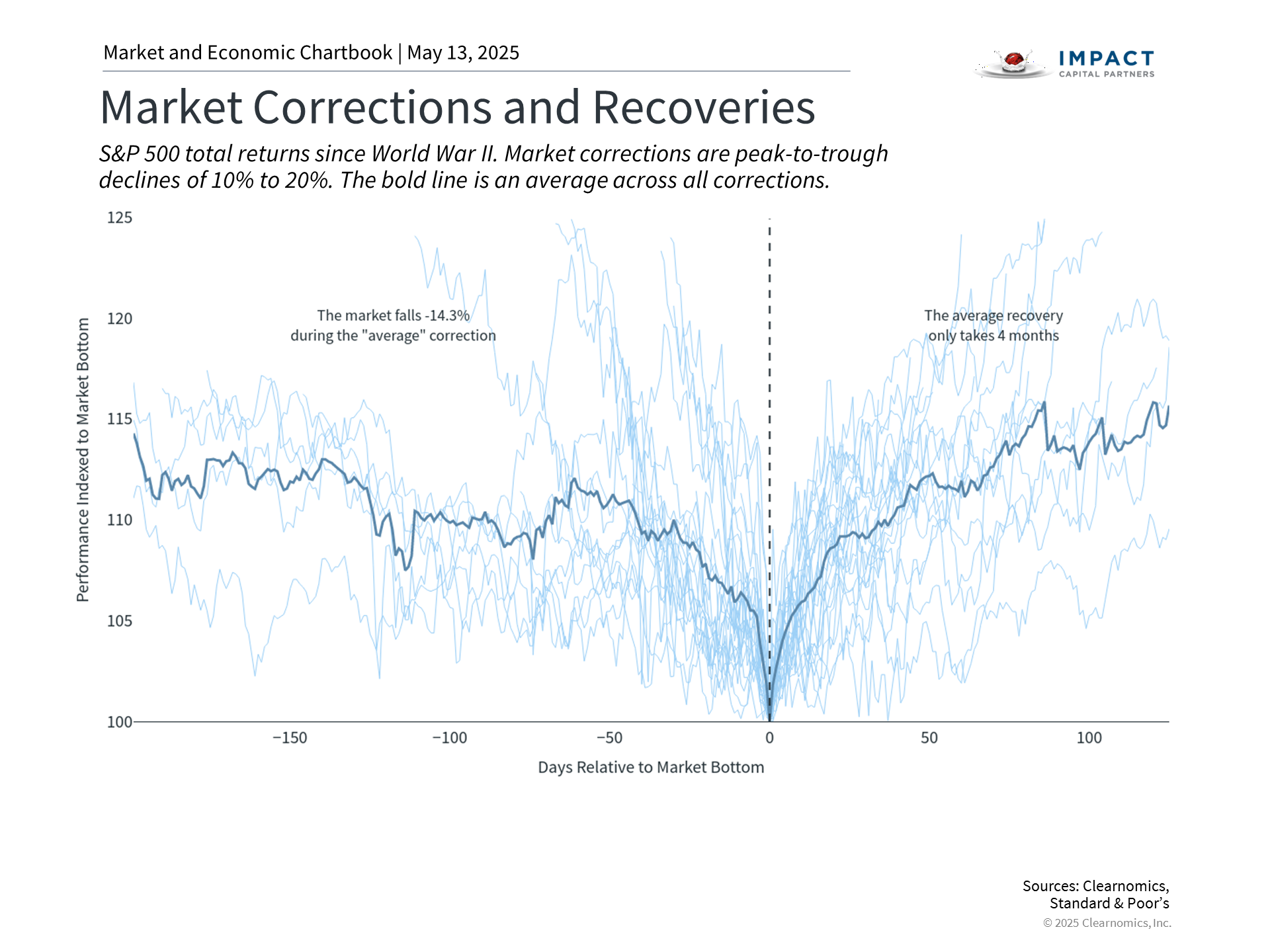 While there are still many risks to the market, the last several weeks show how quickly the narrative can change. By their very nature, markets anticipate worst-case scenarios. During times of negative headlines and market pullbacks, it’s difficult to imagine that the market will ever recover. So, while understanding risks is always prudent, it should not come at the expense of long-term portfolio positioning. The accompanying chart shows how market corrections have behaved since World War II. While the average correction experiences a decline of 14%, it often recovers in as little as four months. Most importantly, it can often rebound when it’s least expected, as we’ve experienced following recent progress on trade negotiations. Those investors who overreact to early signs of volatility may find that they are not appropriately positioned, especially with respect to their financial goals. The bottom line? The latest U.S.-China trade announcement has lowered market uncertainty and recession concerns. For long-term investors, this reinforces the value of maintaining perspective during periods of market turbulence rather than reacting to short-term volatility. | |||
