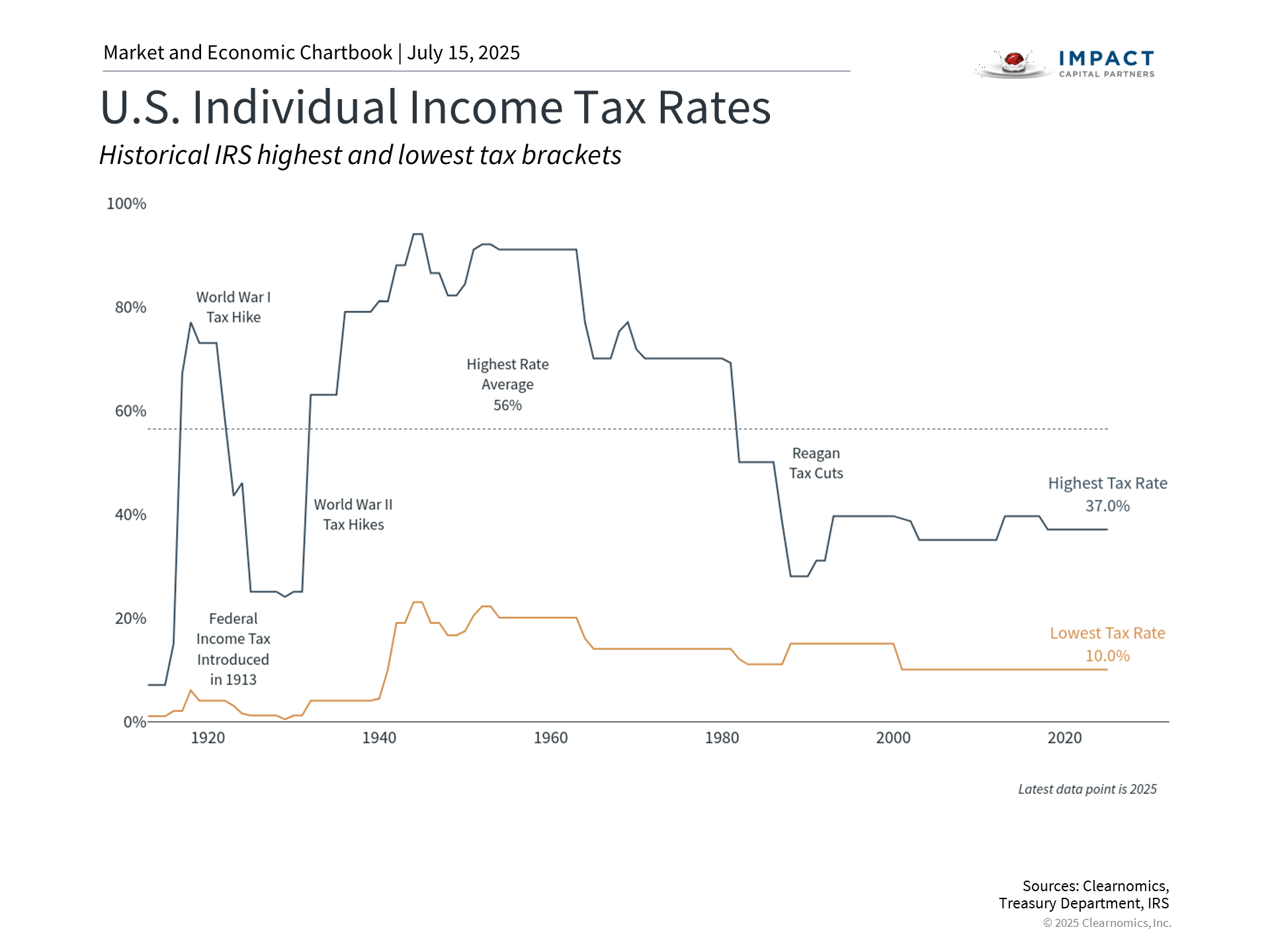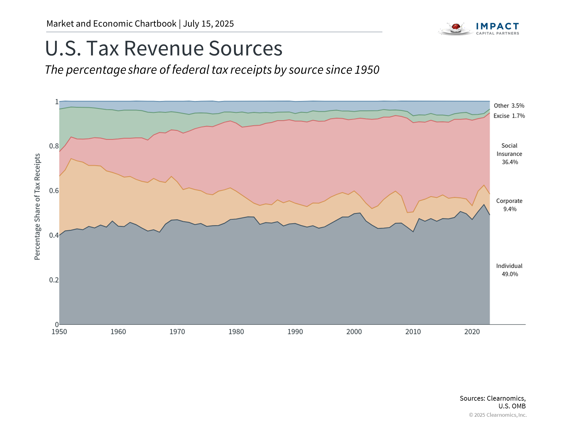 Tax policy and government deficits are two sides of the same coin. This is because tax cuts reduce government revenues which then need to be offset by either lower spending or increased borrowing. However, most government spending is for entitlement and defense programs which are politically difficult to change. According to the Department of the Treasury, in 2025 21% of government spending is for Social Security, 14% for Medicare, 13% is for National Defense, and 14% is to pay interest costs on the existing national debt. It's no surprise then that government borrowing has increased persistently over the past century and will likely continue to do so. The Congressional Budget Office, a non-partisan agency that supports Congress, estimates that this new tax and spending bill will add $3.4 trillion to the national debt over the next decade. This is against the backdrop of a federal debt that already exceeds 120% of GDP, or $36.2 trillion, which amounts to about $106,000 per American. Unfortunately, there are no easy solutions to this challenge, especially because this is a contentious political topic. On the one hand, tax cuts can stimulate economic growth, which may help to offset revenue losses through increased economic activity. On the other hand, Washington has a poor track record of balancing budgets even when the economy is strong. The last balanced budgets occurred 25 years ago during the Clinton years, and 56 years before that during the Johnson administration. It’s also important to remember that there has not always been an income tax in the United States. The modern income tax system began with the 16th Amendment in 1913 which applied modest rates to relatively few Americans. The system expanded dramatically during the Great Depression and World War II, with top rates reaching 94% by 1944. The post-war period brought various reforms, including President Reagan’s Tax Reform Act of 1986 that simplified the tax code and lowered rates. The situation has changed significantly in the intervening years. As the accompanying chart above shows, individual income taxes now represent the primary source of federal revenue. Social insurance taxes, also known as payroll taxes, are withheld from wages and help to pay for Social Security, Medicare, unemployment insurance, and other programs. Other sources of revenue are much smaller in proportion and include corporate taxes, which were reduced by the TCJA, and excise taxes, such as tariffs. For investors, tax policies can certainly have direct implications on financial plans and portfolios. From a macroeconomic perspective, however, fiscal implications have more limited effects. Over longer periods, higher debt levels can influence interest rates and inflation expectations. While these factors have been relatively high in recent years, many of the worst-case scenarios have not yet occurred. The key for long-term investors is to maintain diversified portfolios that can perform across different fiscal and economic environments, rather than reacting to policy changes alone. The bill continues the higher estate tax exemption limit